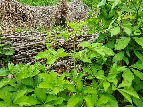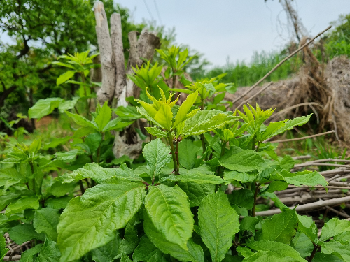 나는 이번이 두번째 채취인데, 5월6일 정도 되니 오가피순이 쇠어서 부드럽고 여린 가지를 따는 것은 살짝 노하우가 필요하기도 하다. 먼저 잎사귀 표면이 반들반들하고 연한 녹색의 잎을 가진, 위로 자란 순을 찾는다. 적당한 위치의 가지를 꺾었을때 똑 하고 잘 부러져야 먹을 수 있는 상태. 똑하고 잘 부러지지 않고 질긴 기운이 남아 있으면 그 위부분을 다시 꺽어 보아야~